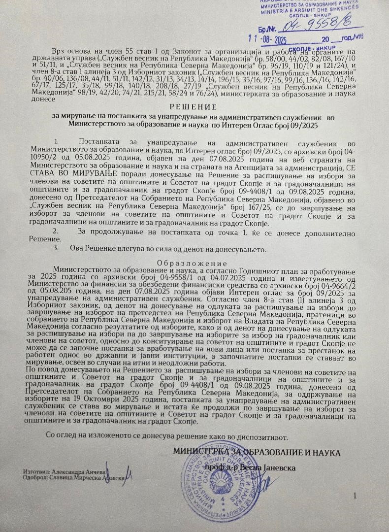 Решение за мирување на постапка за унапредување на административен службеник во МОН Решение за мирување на постапка за унапредување на административен службеник во МОН